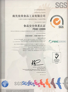 南充佳美于2018年取得了FSSC 22000食品安全體系認(rèn)證證書。