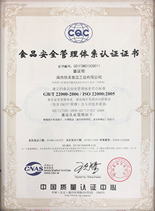 公司于2008年按ISO 9000標(biāo)準(zhǔn)建立質(zhì)量管理體系,同時取得ISO 9001質(zhì)量體系認(rèn)證證書、HACCP 體系認(rèn)證證書,并于2018年取得ISO 9001:2015質(zhì)量體系認(rèn)證證書。公司于2014年按ISO 22000標(biāo)準(zhǔn)建立食品安全管理體系,同時取得ISO 22000食品安全管理體系認(rèn)證證書。南充佳美不斷提升與進(jìn)取,于2018年取得了FSSC 22000食品安全體系認(rèn)證證書。